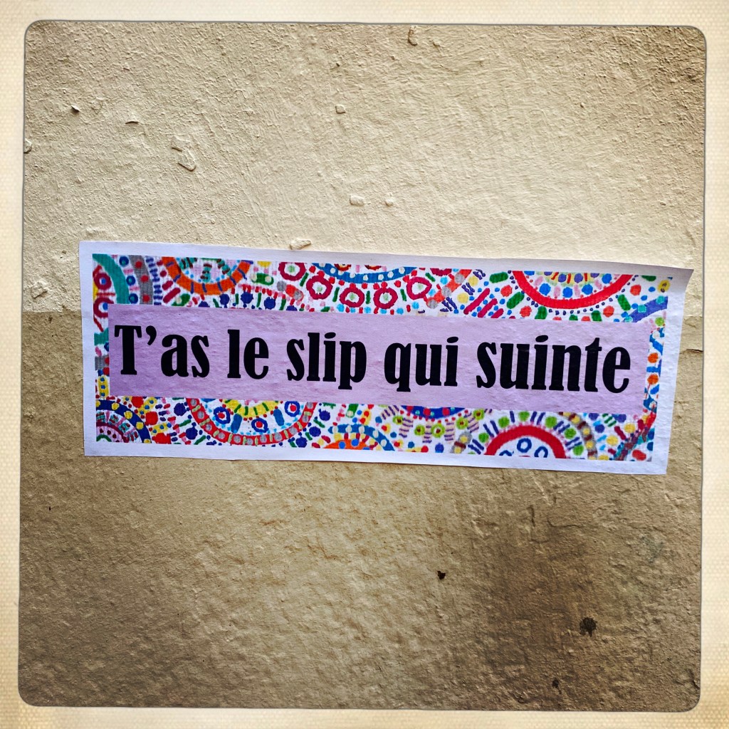 La mise en page laisse à désirer mais on reste sur de l’éphémère qui partira sous une éponge de concierge ou sous la pluie… C’est vrai que dans la vraie vie faudrait plancher sur le concept de l’insulte qui s’efface et ne reste gravée ni dans l’estime ni dans l’ego. On doit pas encore avoir les bonnes éponges, c’est pour ça.