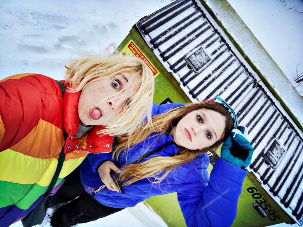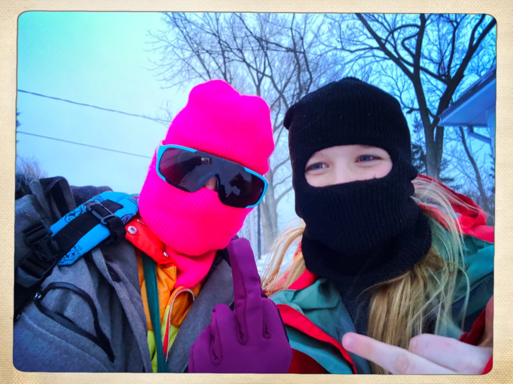 Après avoir enduit nos artères de gras et de sucre, (et d’opiacés pour moi! Youpi!) on a commencé à superposer des couches textiles sur nos corps fatigués… aucun swag mais le concept et la priorité en cet instant c’était de survivre au froid. A 7h et des patates on était dehors… en pleine tempête, et en plein fou rire.