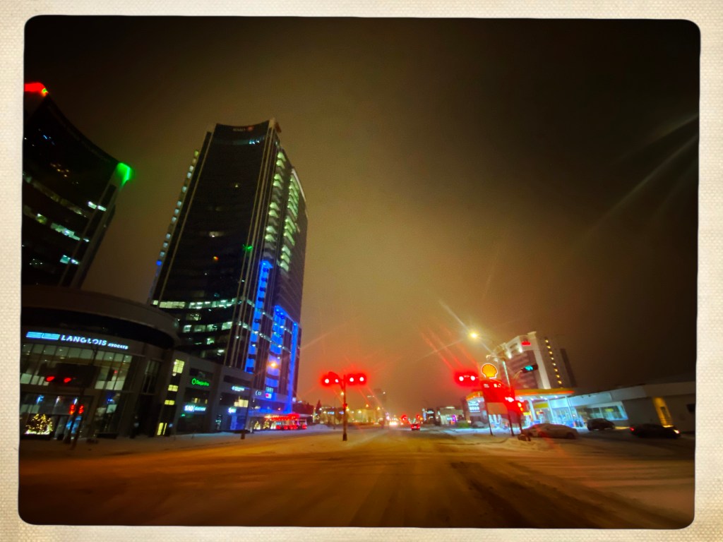 J’arrive à la station Shell en rêvant d’un jus d’orange et d’une banane (ouais j’ai le matin exotique quand il neige) et la je me rends compte que non seulement elle est fermée (pas si grave) mais que j’ai oublie mon portefeuille. Mon portefeuille de substitution prêté par E, avec la carte de crédit que C Met à ma disposition. Purée mais comme je me fatigue… c’est un truc de dingue!