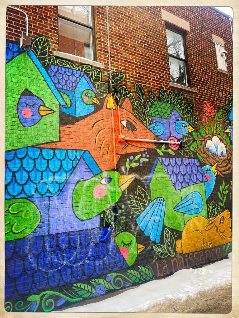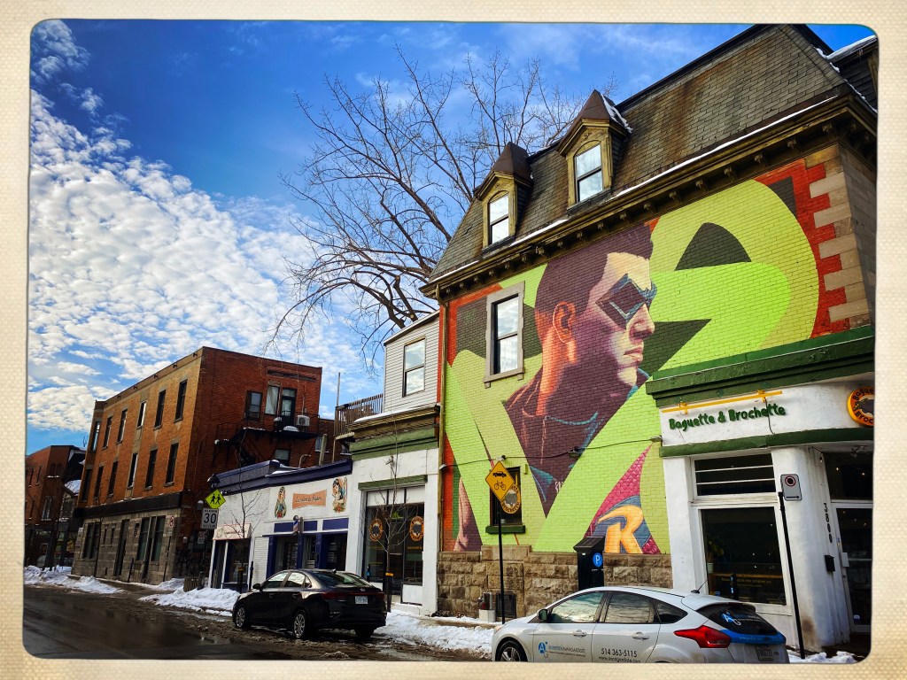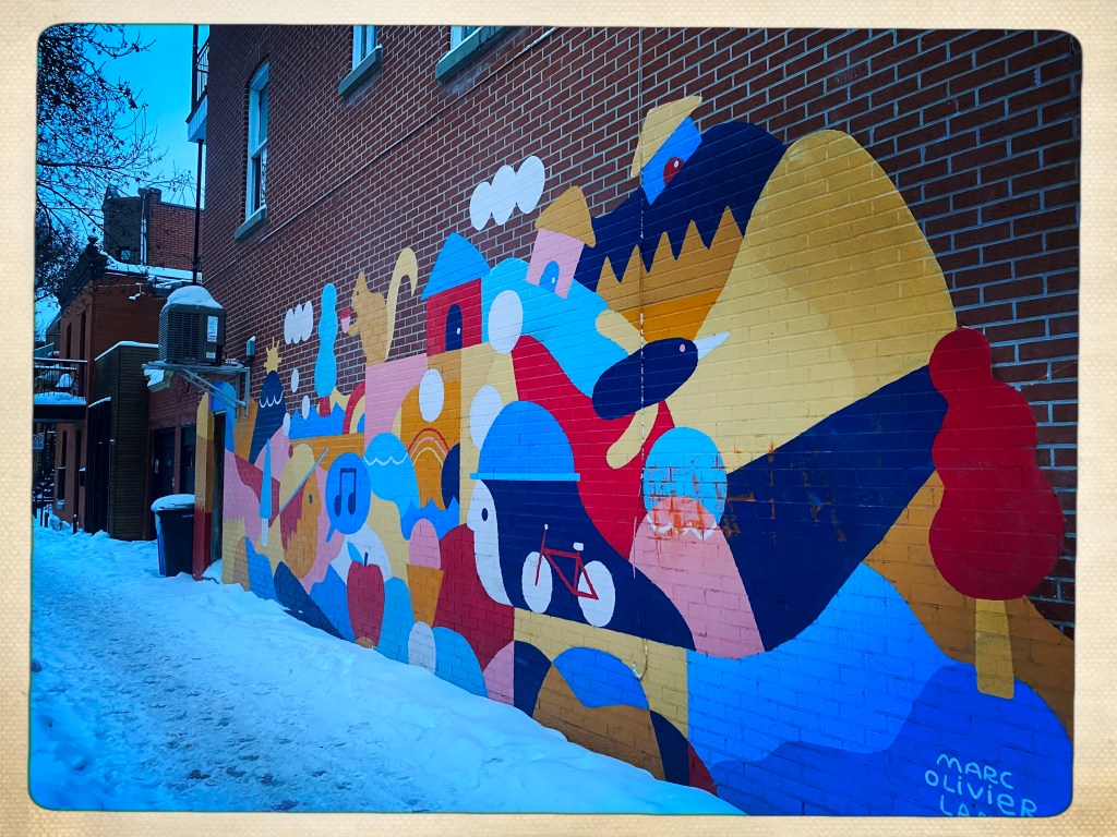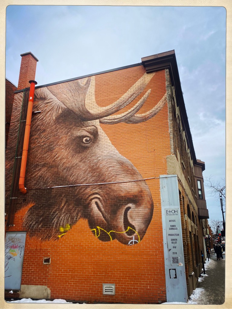 Arrivée à Montréal et le quartier est un peu glauque mais je me fais immédiatement des amis SDF et crackers (un mec qui a le froc aux genoux vomit un truc blanc à côté de mes pieds) attirés par la luminosité de ma doudoune arc en ciel. On veut me revendre des affaires de ski à prix cassé mais bon, j’ai pas une piastre. Et je vais pas assez au ski.