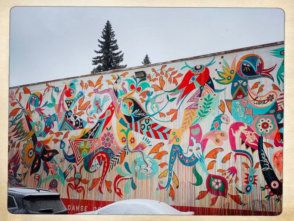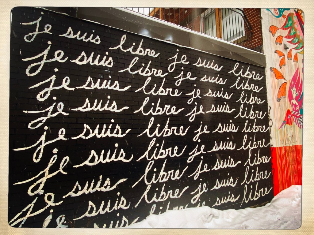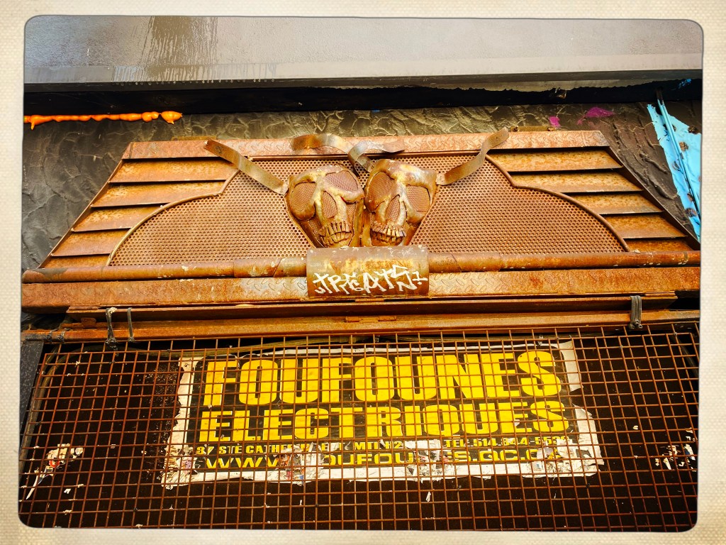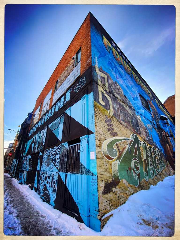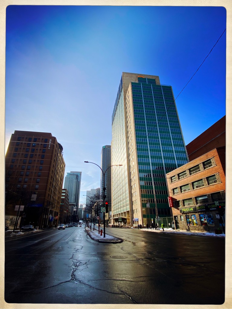 Arrivée à Montréal et le quartier est un peu glauque mais je me fais immédiatement des amis SDF et crackers (un mec qui a le froc aux genoux vomit un truc blanc à côté de mes pieds) attirés par la luminosité de ma doudoune arc en ciel. On veut me revendre des affaires de ski à prix cassé mais bon, j’ai pas une piastre. Et je vais pas assez au ski.