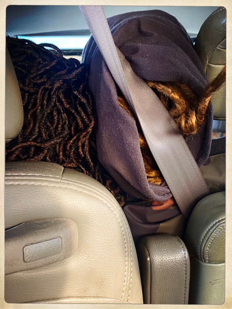 Mon « chauffeur » Alain arrive. Il a un accent mi créole mi quebequois c’est assez intéressant. Comme de boire du rhum arrangé en faisant des raquettes. Je m’assois comme d’hab à la place du fond sur la deuxième banquette arrière, nous sommes 5 passagers et personne ne parle. Franchement ça me va bien vu qu’il est 7 h du mat que cette histoire de portefeuille m’a saoulé (après un gros fou rire nerveux sous la neige). Alain a mis du zouk enflamme que j’entends loin derrière mes écouteurs… ce serait cool si j’arrivais à dormir un chouïa mais je commence à soupçonner mon animal totem d’être un insecte hyperactif et pas forcément utile. Genre le truc qui dort jamais mais sans but particulier.