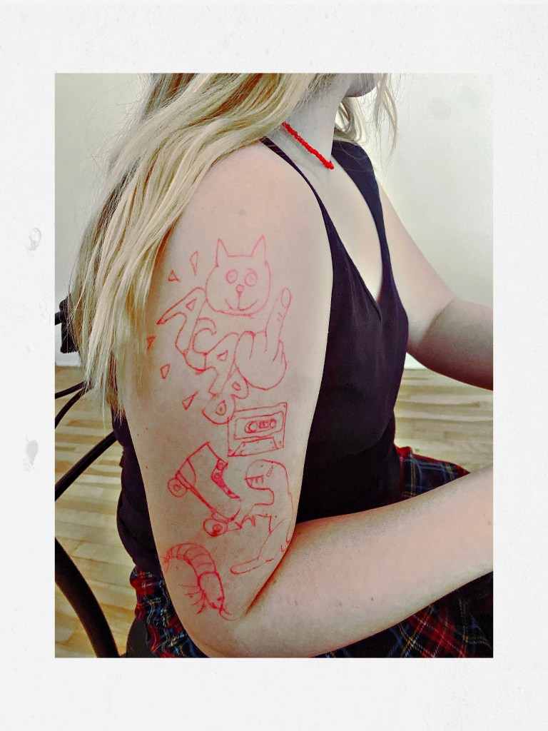 Contre toute attente la Z décide de faire un peu de devoirs… elle rédige son rapport de stage pendant que je la tatoue au stylo bic rouge.