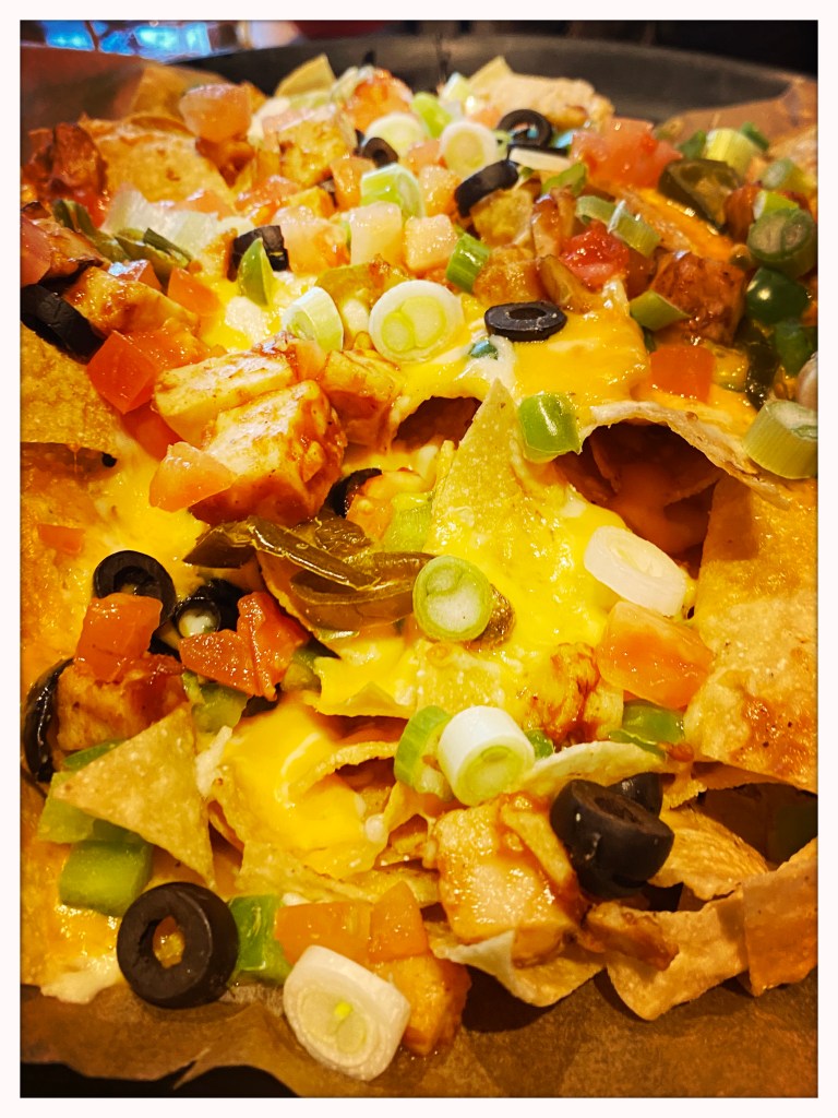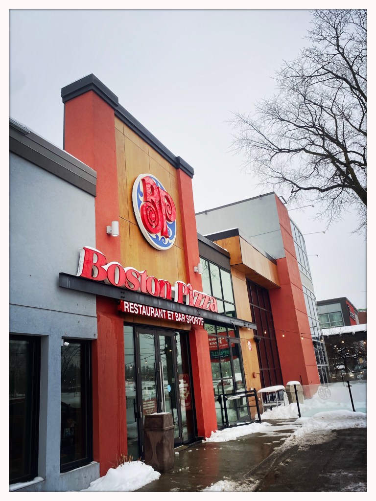 Off we go vers le restau d’E. Il s’agit d’un bar sportif situé près du campus, c’est grand et ça sent la testostérone et le chlore car ça diffuse des match de hockey sur écran géant et juste à côté il y a une piscine. Et un sauna. Info qu’on avait oublié de nous transmettre. J’y aurais bien sué un peu…