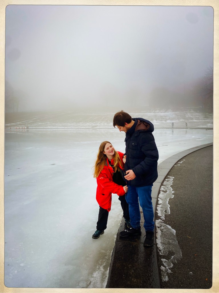Quant à moi je commence à remettre en doute cette histoire de chance et de chaussettes car je fais un vol plané sur glace qui me vaut une cuisse violette et un coude meurtri… souvenirs gratos.