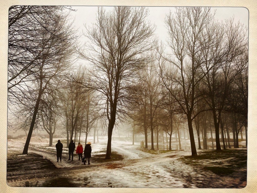 On se déplace collectivement jusqu’au parc de mont royal et côté racoons c’est l’über-fiasco. Côté vue sur la ville aussi vu qu’on est dans la purée de poix…