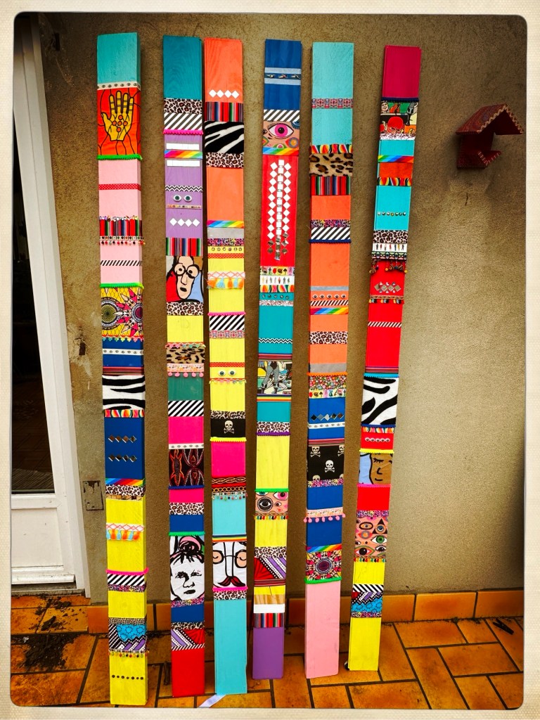 Et le jardin ça peut être un espace de créa aussi… en ce moment j’y traîne mon enceinte et mes pinceaux, pour plus tard y ramener mes tissus et mes rubans… je suis solo, chic de ouf avec ma polaire, au soleil face à la montagne baignée de lumière, avec juste la musique et la reine des frelons asiatique qui me tourne autour en cherchant à caser sa nouvelle caserne… (elle perd rien pour attendre… j’attends qu’elle choisisse son spot pour mieux la virer au valhalla des relous volatiles).