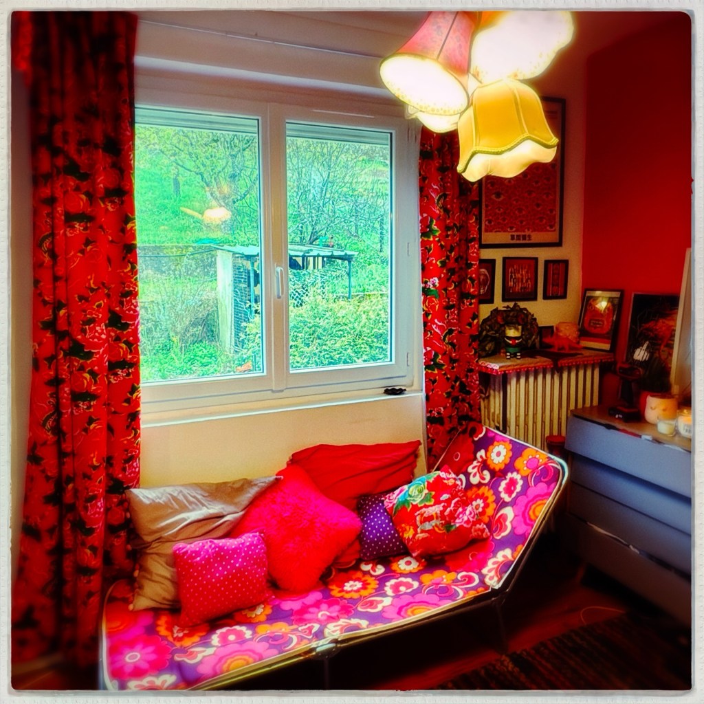 Et je n’ai plus physiquement le temps et la capacité d’être moi. Pas assez d’heures pour créer si je veux cocher toutes les cases de mes listes de taches chiantes et obéir à mes nouveaux rituels (par exemple tous les soirs remplir 3 bouillottes pour aller me coucher dans ma chambre rouge et rose, sous une couette et une couverture pondérée (7kilos, le modèle bonhomme) pleine de chaleur flottante, comme in utero).